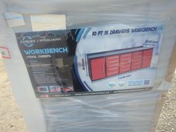 10' WORKBENCH / TOOL BOX WITH (30) DRAWERS, TOP CABINETS & METAL PEGBOARD ***UNUSED ***